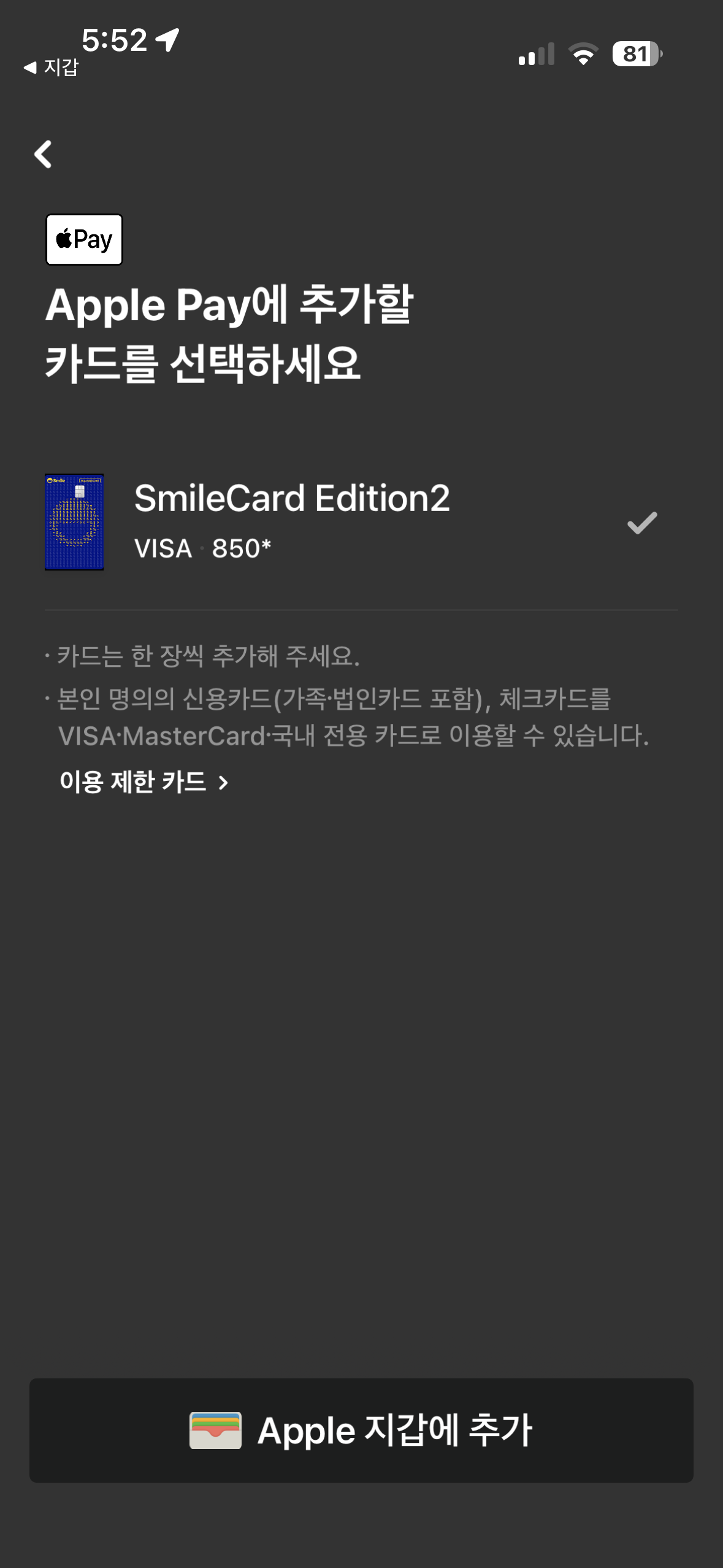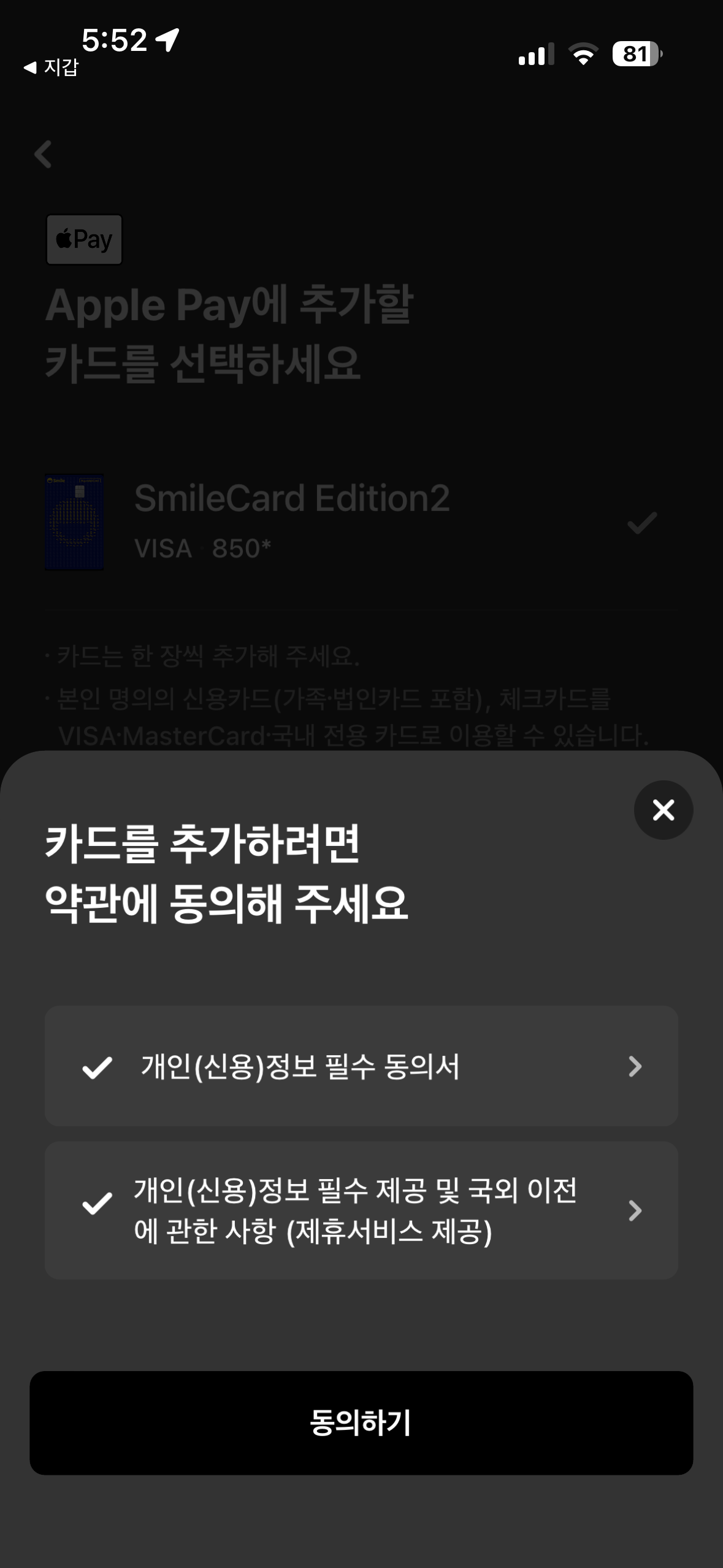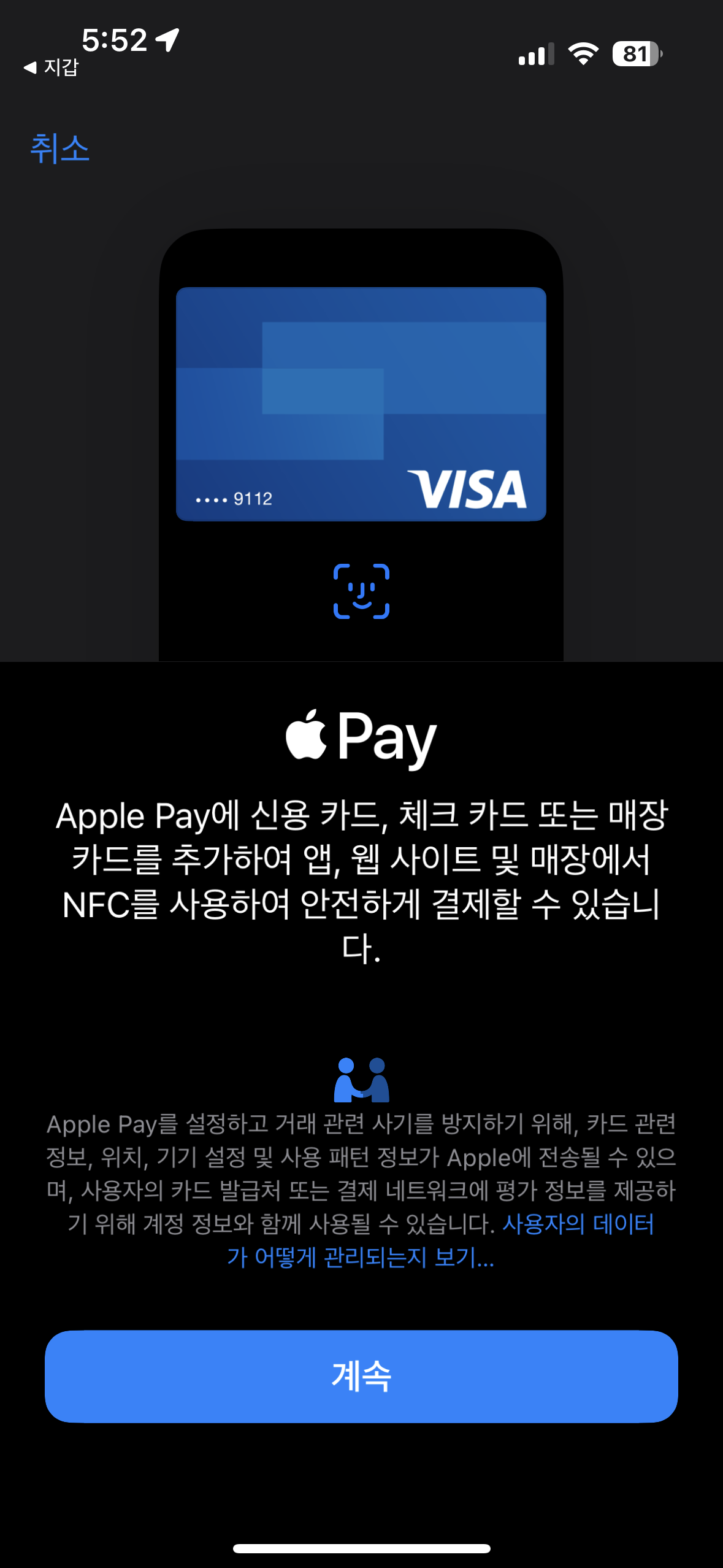 이렇게 애플 지갑에 애플페이로 현대카드를 등록해보았습니다. 요약을 하자면