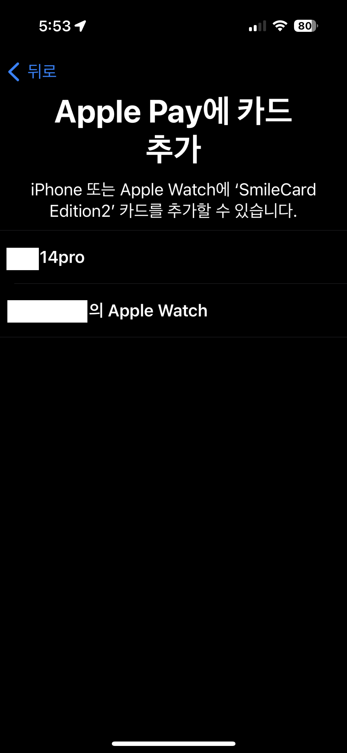이후 폰에 카드를 저장할 지, 애플 워치에 저장할 지를 묻습니다. 먼저 폰에 저장을 해보겠습니다.
