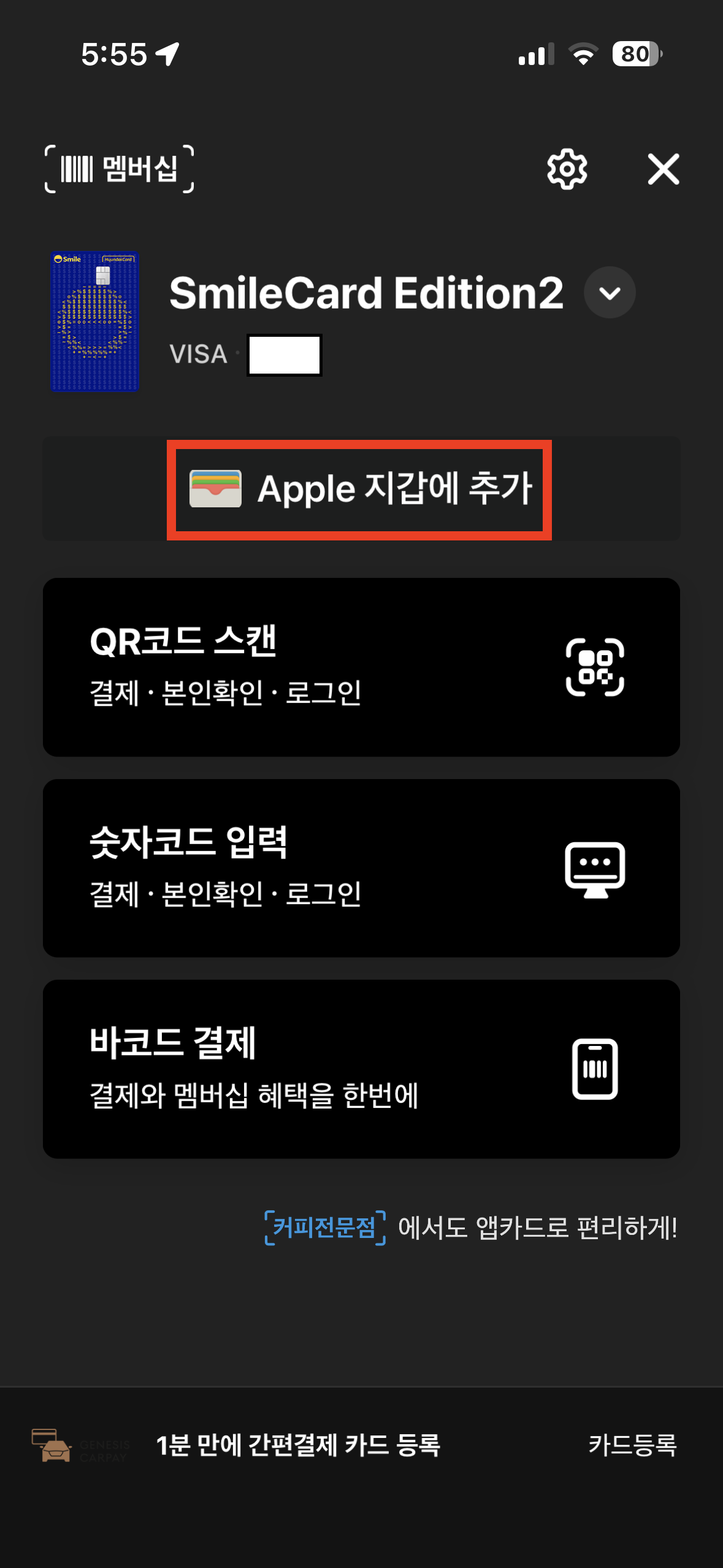 또는 바로 현대카드 앱에서 'Apple 지갑에 추가'를 눌러도 됩니다.