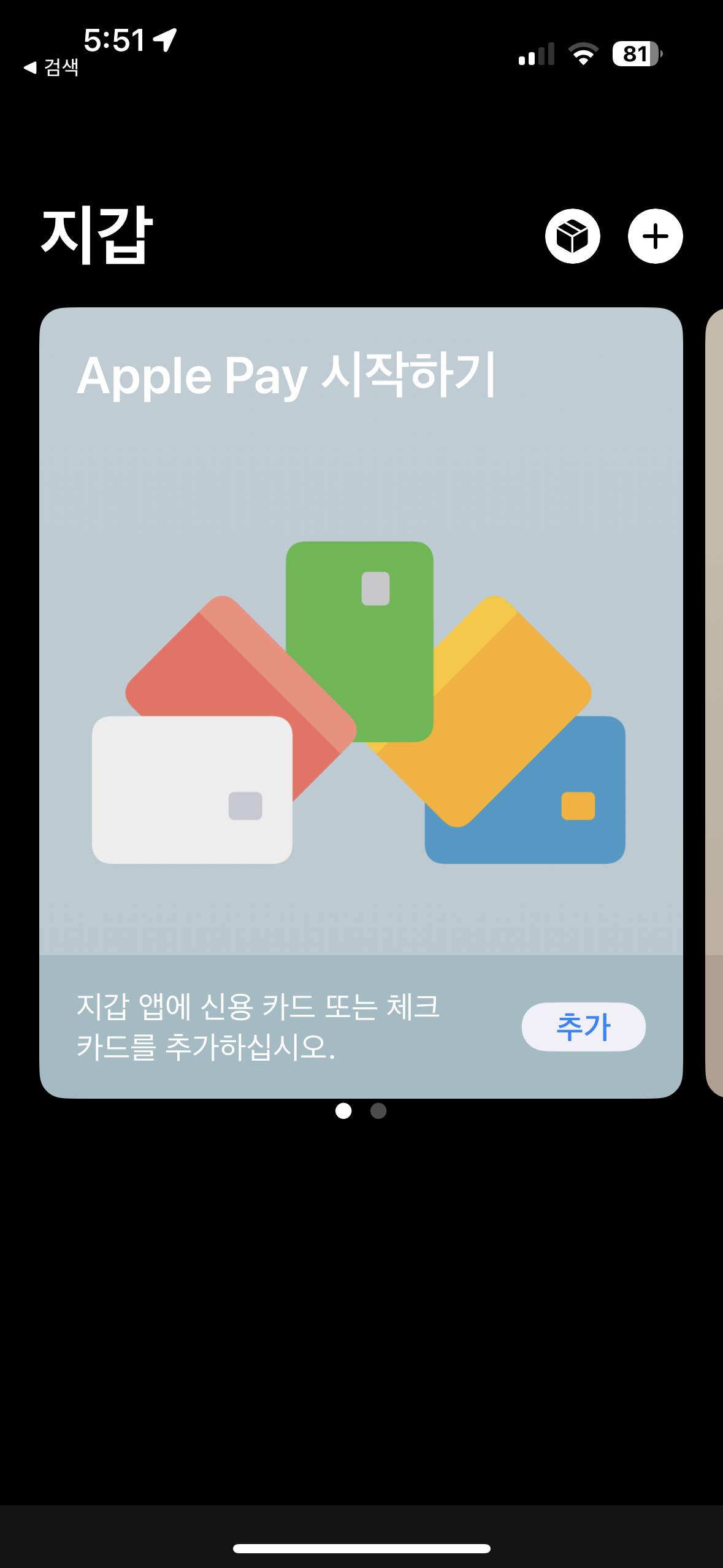 두 가지 시작 방법이 있습니다. 아이폰 기본 앱인 '지갑' 을 이용하거나, 현대카드 앱에서 시작이 가능합니다. 그동안 열어본 적이 없던 앱 '지갑'을 엽니다. 그러면 아래 스샷처럼 나오는데, 여기서 하단의 '추가'를 누릅니다.