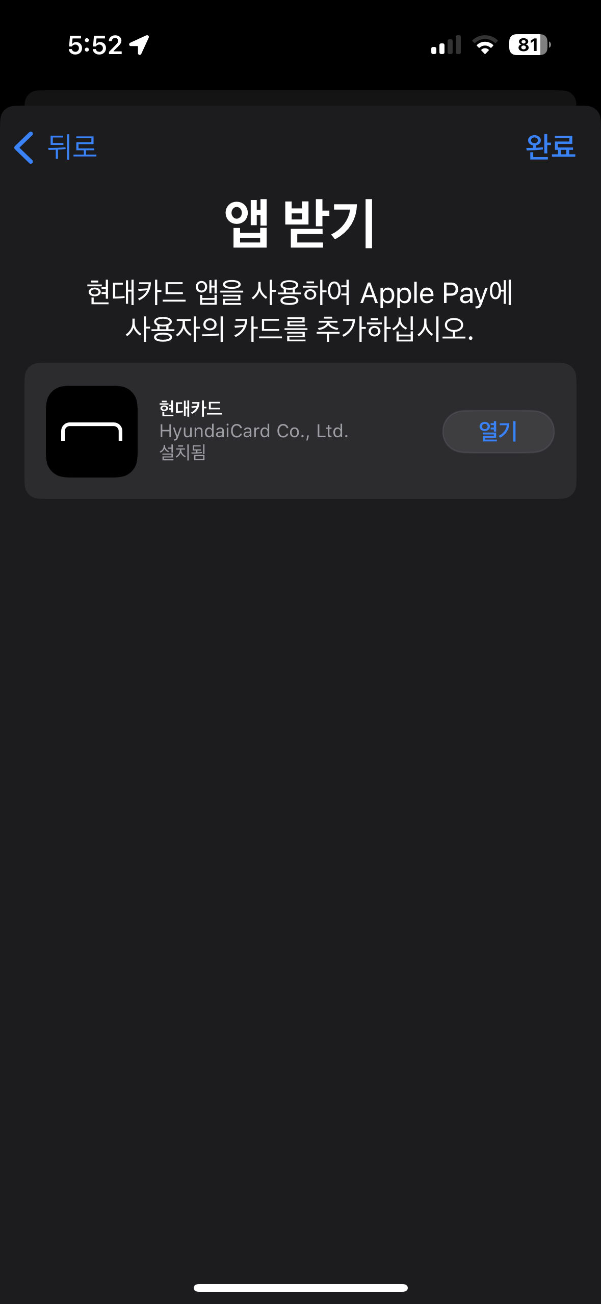 결국 현대카드 앱에서 애플 지갑으로 등록을 하는 것입니다.