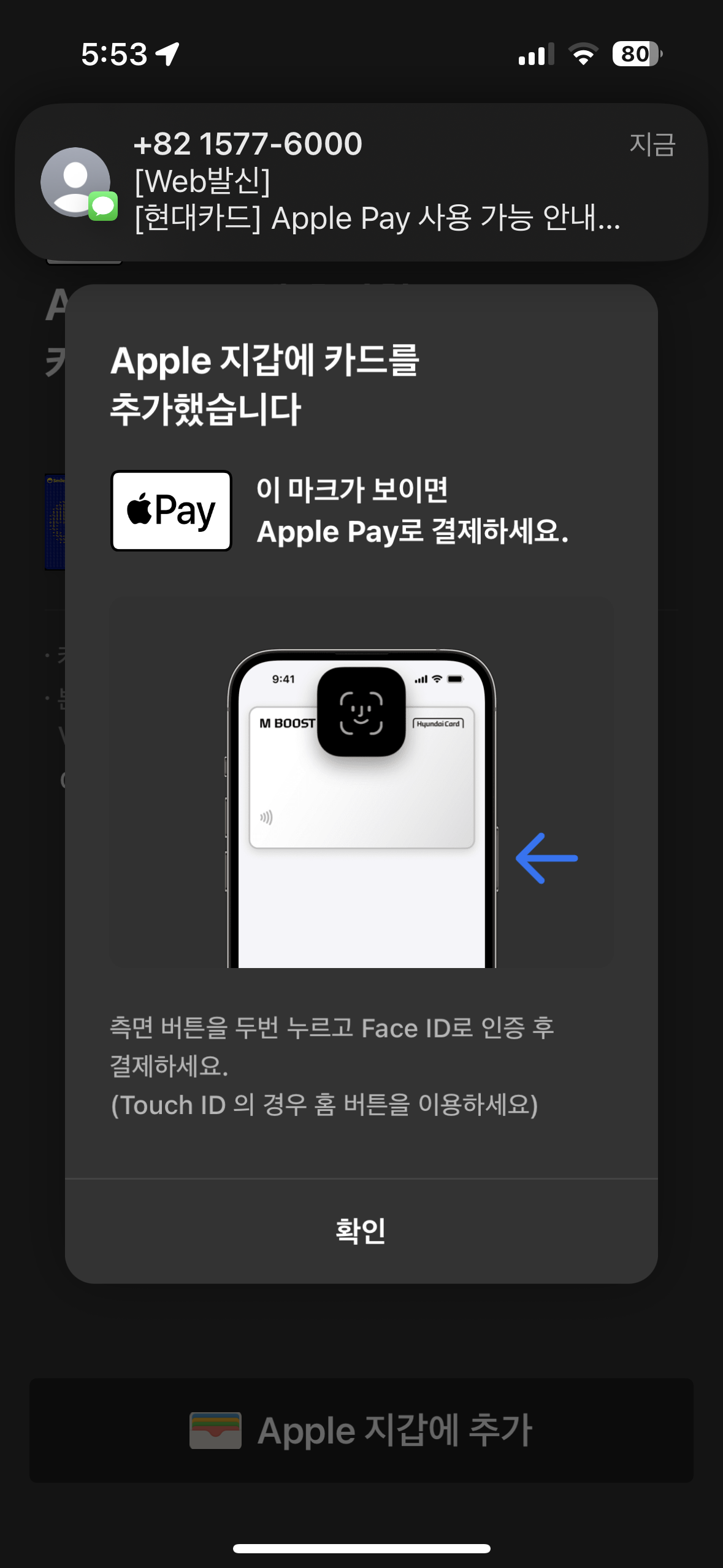 이후 계속 진행을 하면 손쉽게 애플 지갑에 현대카드가 추가됩니다. 완료되고 나면 바로 현대카드에서 문자가 옵니다.