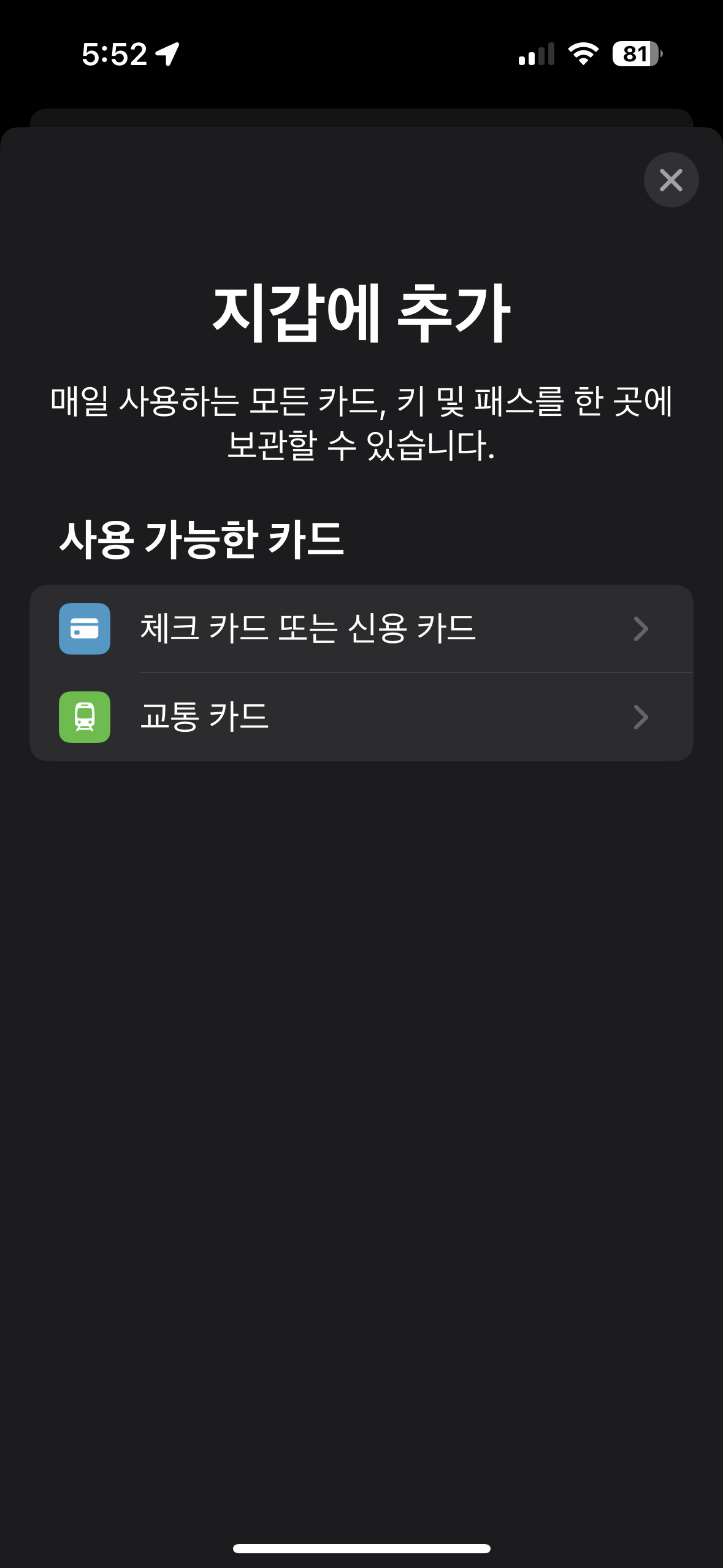 애플 지갑 앱에서 추가를 누르면 아래와 같이 나오는데, '체크 카드 또는 신용 카드'를 누릅니다.