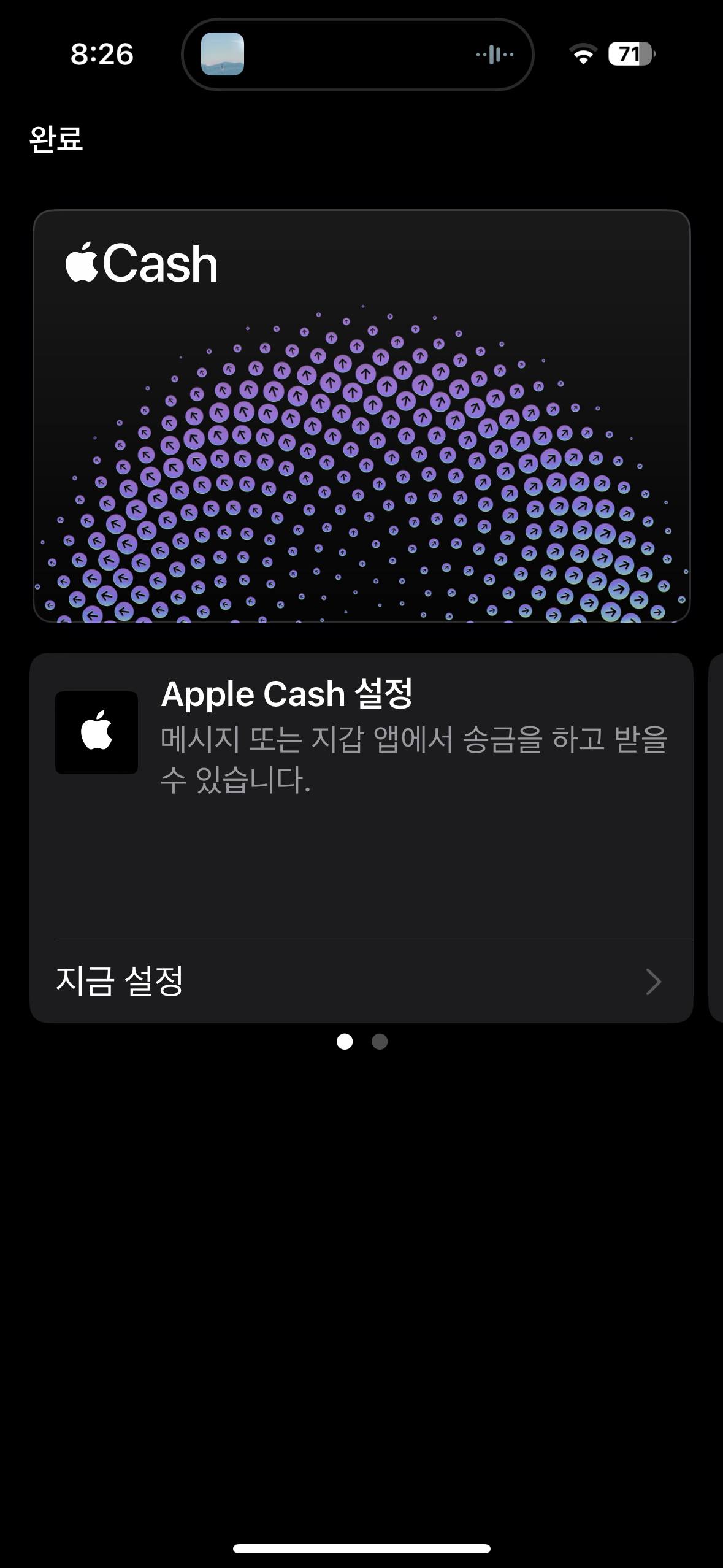 지갑 앱에 애플 캐시 기능도 있어서 뭐지 하고 눌러 봤습니다. 메시지 또는 지갑 앱에서 현금을 송금도 할 수 있는 기능인 것 같습니다. 토스와 비슷한 기능인 것 같아서 눌러봤는데!