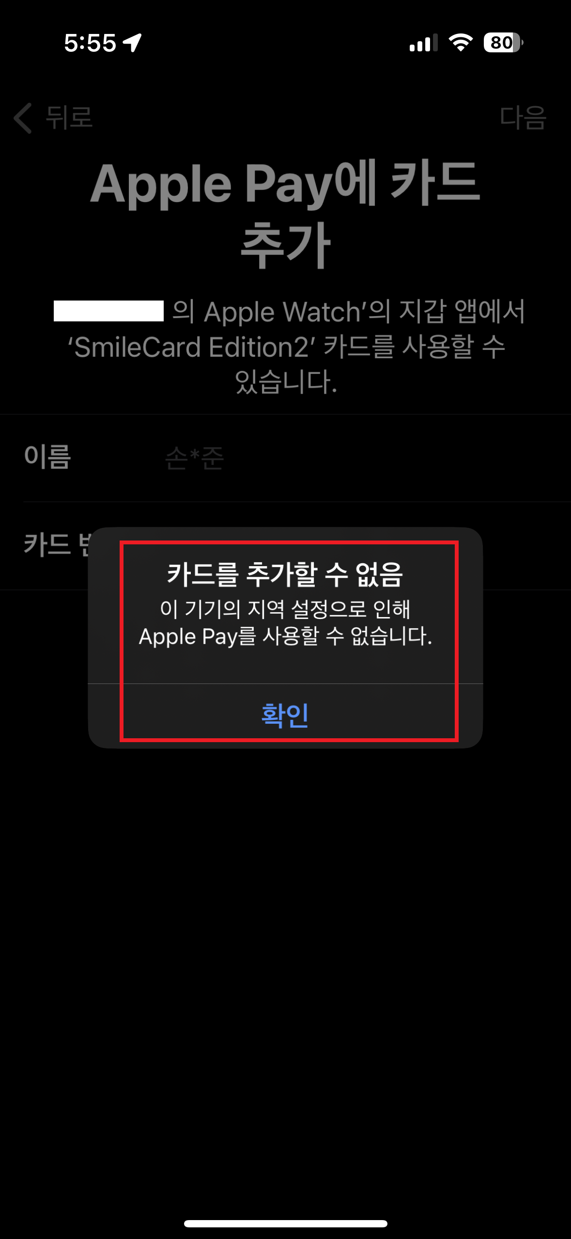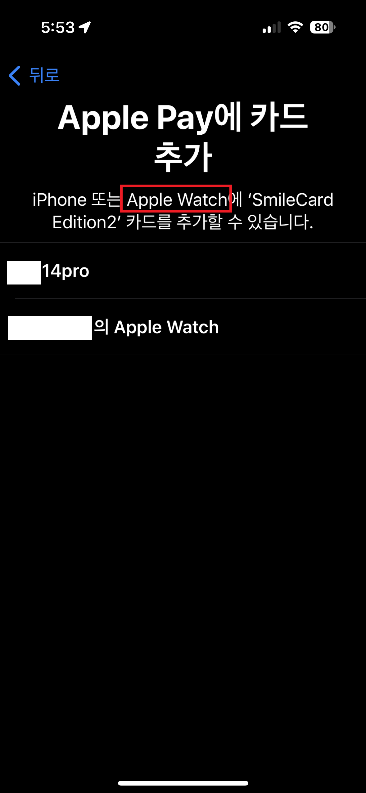 오늘의 결론! 혹시나 애플워치에 애플페이 카드 등록이 되지 않는다면