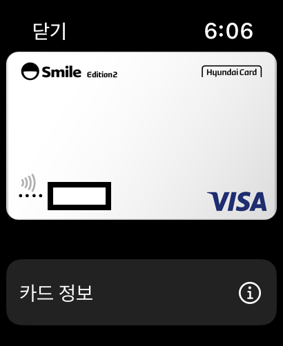 애플워치에서 지갑 앱을 열어서 확인해보면 이렇게 정상적으로 현대카드가 애플페이에 등록된 것을 확인할 수 있습니다.