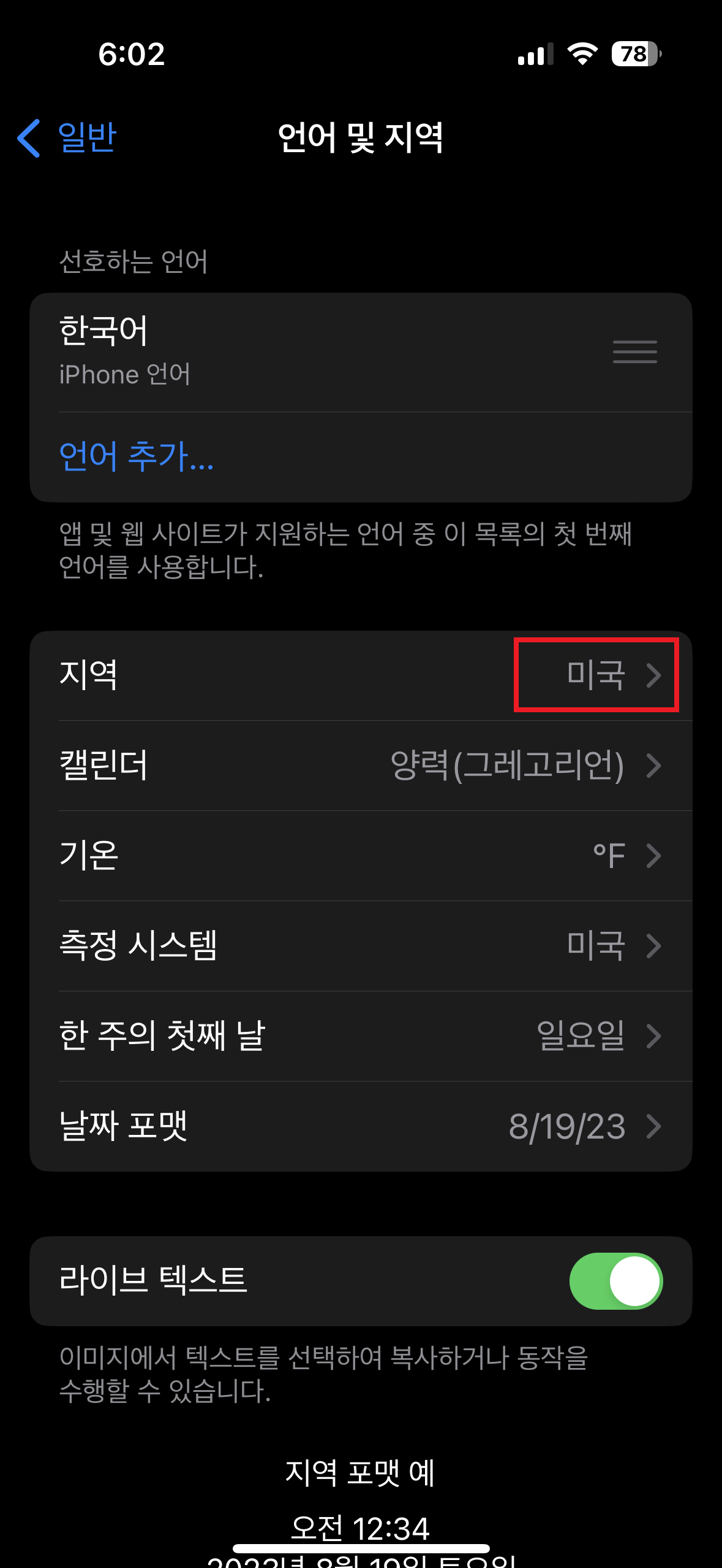 설정 - 일반 - 언어 및 지역 - 지역= 미국
