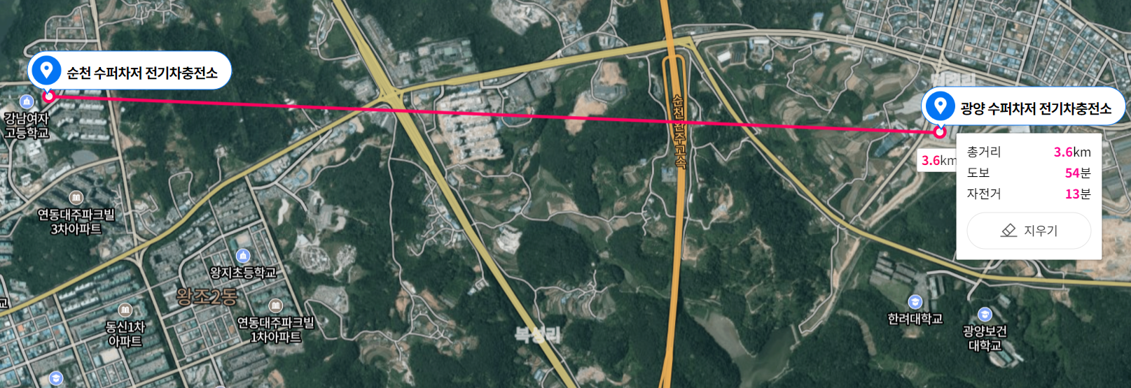 순천 수퍼차저와 광양 수퍼차저의 직선거리는 불과 3.6km 정도밖에 되지 않습니다.