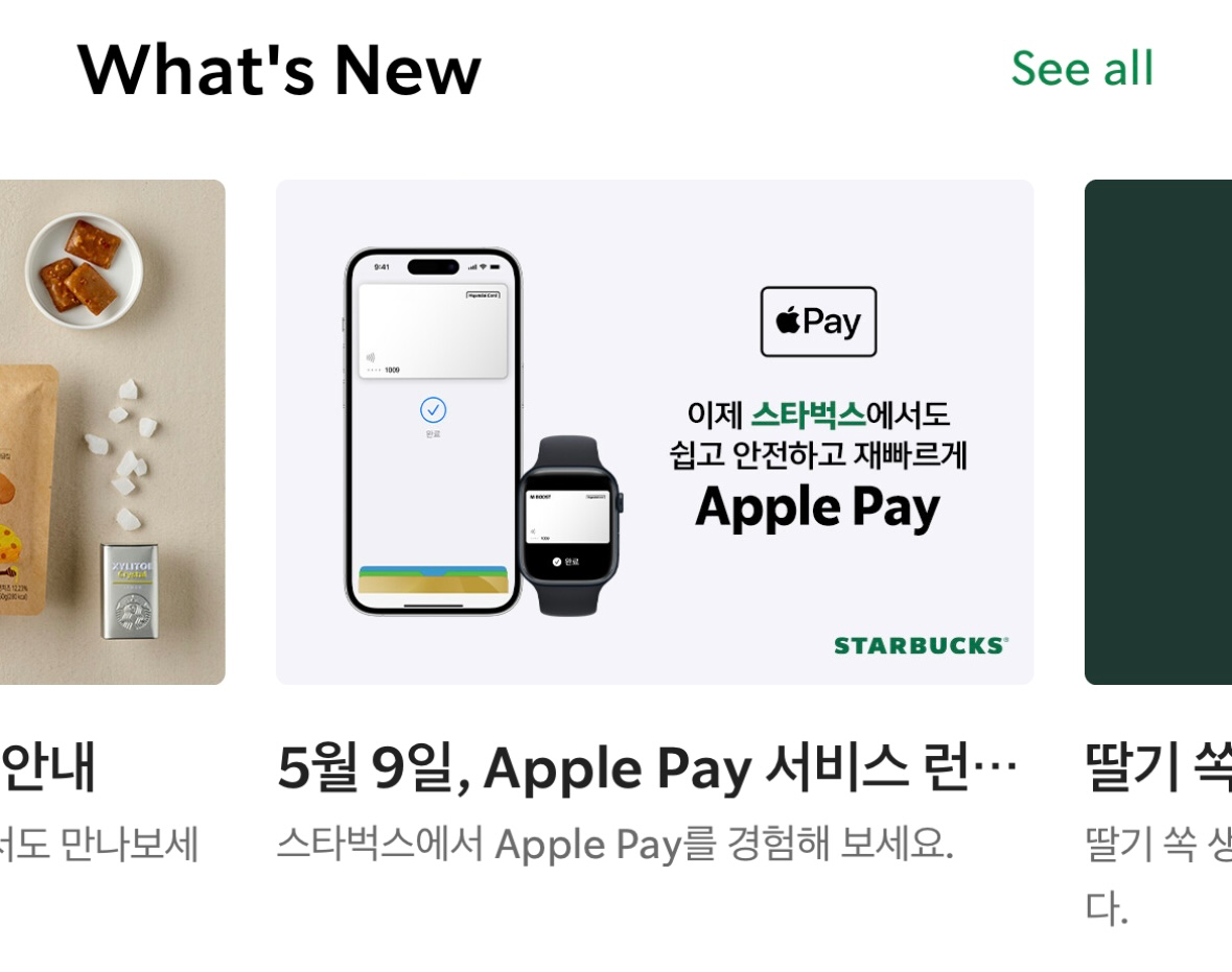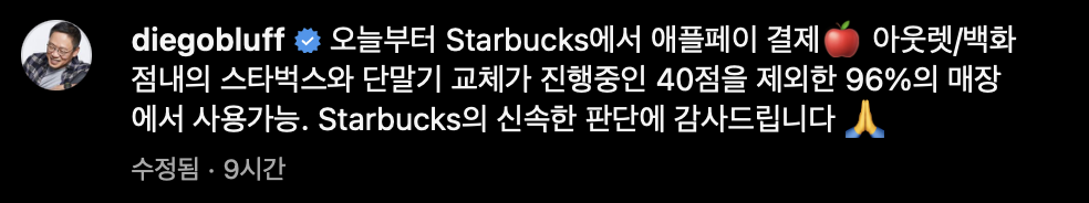 그래도 늦었지만 스타벅스의 애플페이 서비스 시작을 환영합니다.