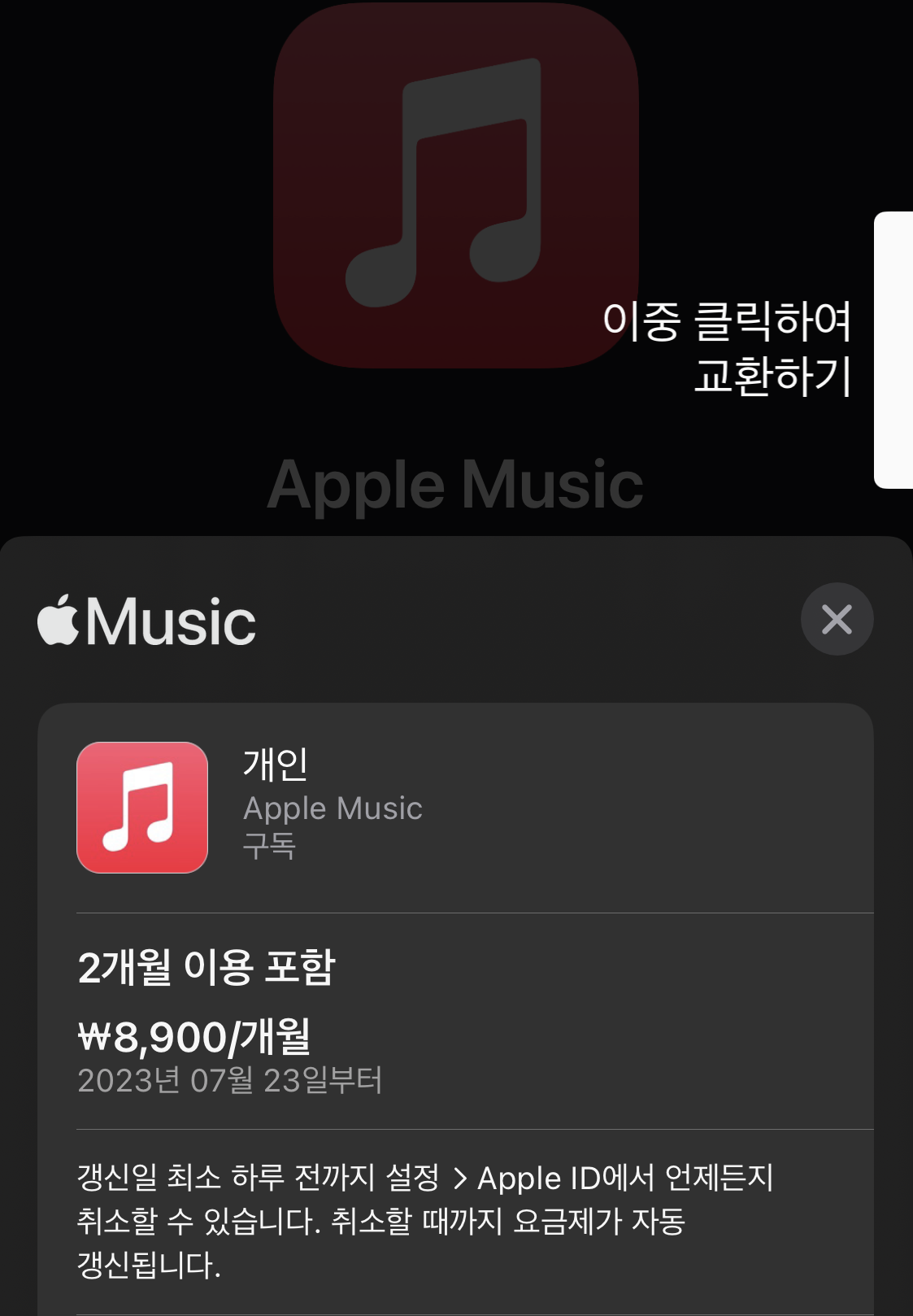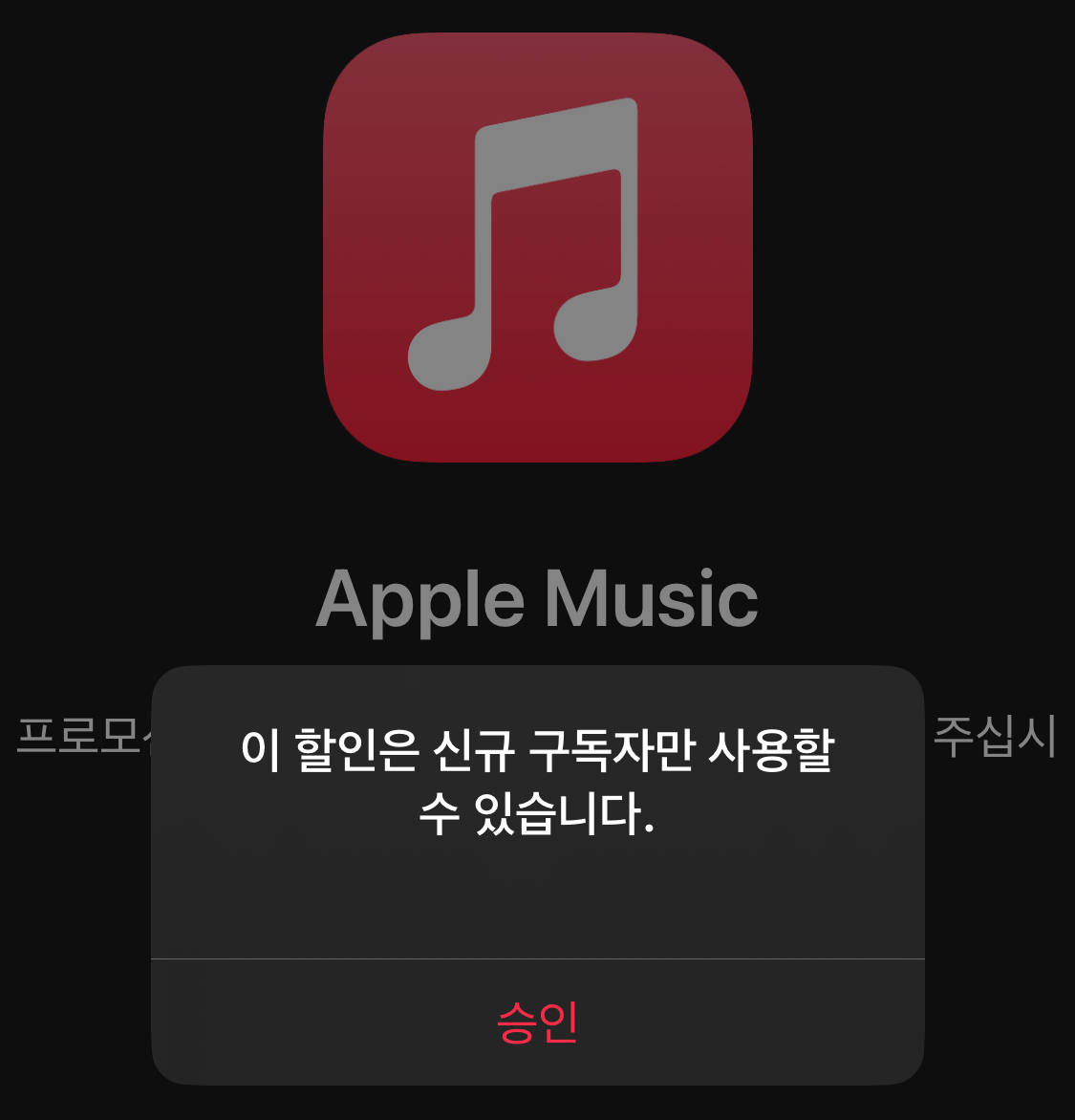 시험 삼아, 애플 뮤직 결제를 진행해보았습니다. 참고로, 저는 이미 애플뮤직 유료 결제 이력이 있기에 신규 구독자 혜택을 받을 수 없습니다. 이번 이벤트에서 애플뮤직은 신규 구독자만 대상으로 3개월 무료 서비스를 제공한다고 합니다. 그래도 한 번 눌러보았습니다. 혹시 실수로 진행이 될 수 있으니 말이죠.