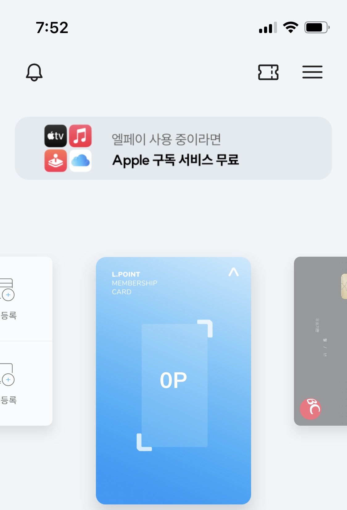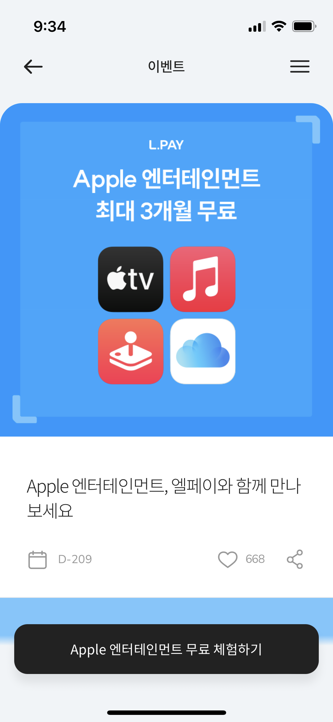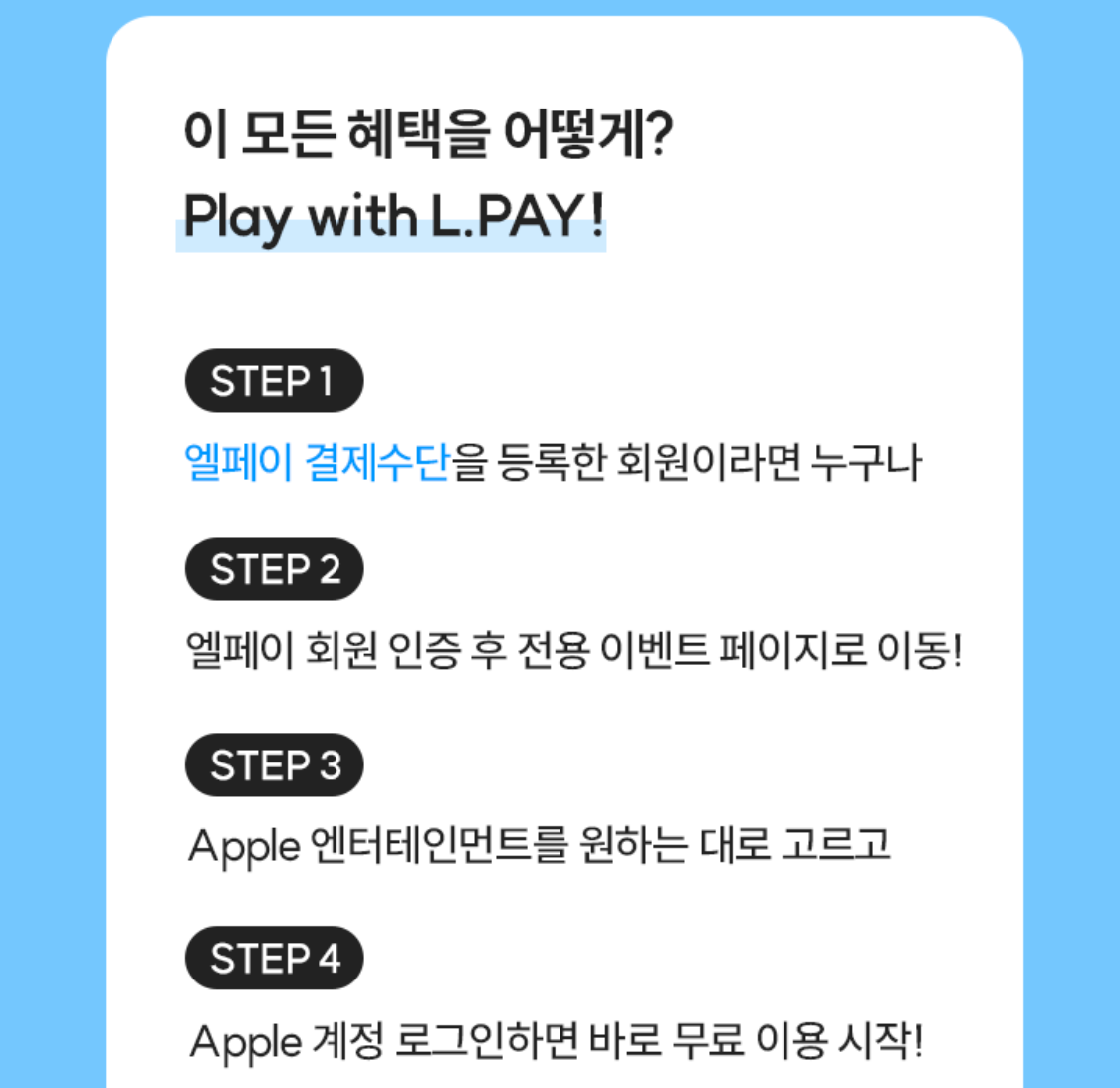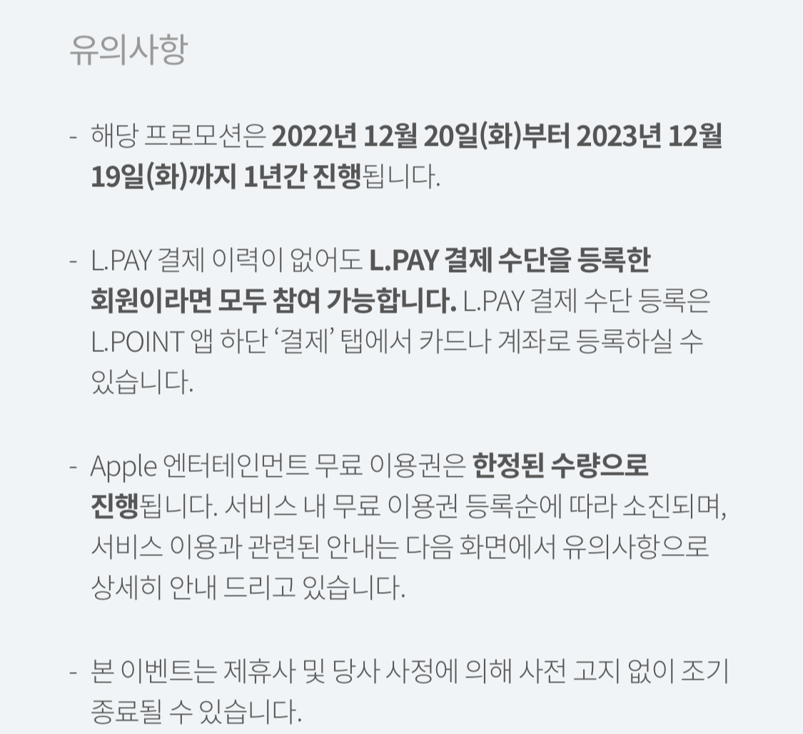 결제 페이지에서 맨 위에 보면 '엘페이 사용 중이라면 Apple 구독 서비스 무료'라는 이벤트 페이지가 나옵니다. 눌러서 들어가면 됩니다. 예전에는 앱 첫 화면에도 이벤트 연결 광고가 나왔는데 지금(23.6.2)은 나오지 않습니다. 잘 찾아가셔야 합니다.