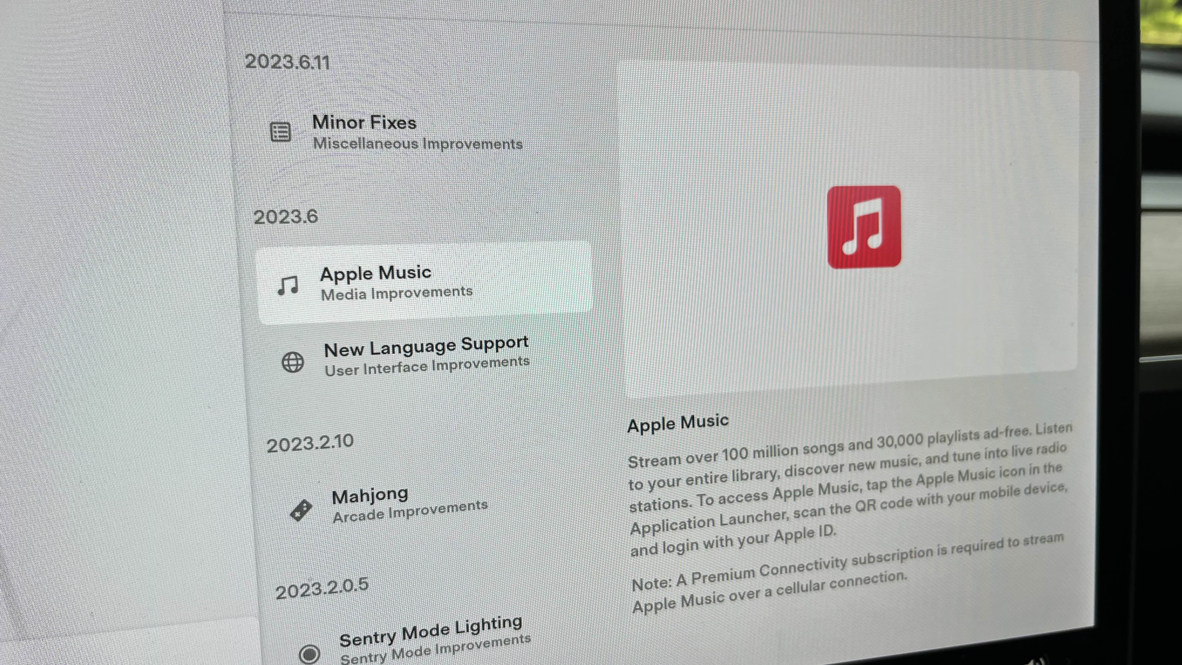 최근 제 모델3에서 오랜만에 업데이트가 떴습니다. 저에게는 정확히 23년 6월 3일 밤에 업데이트가 떠서 설치는 6월 4일 새벽에 하였습니다. 이번 업데이트로 드디어 애플 뮤직이 테슬라에 추가되었습니다. 이제 스포티파이 외에도 애플뮤직을 테슬라 차량에서 들을 수 있게 되었습니다.
