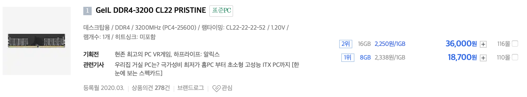 다나와에서 제 메인보드에 맞는 램을 검색하니 매우 저렴한 것을 알 수 있었습니다. 원래 달려 있던 램이 GeIL 제품이라 똑같은 걸 주문하려고 했습니다. 16기가 램이 36,000원밖에 안 하네요. 그 동안 램이 엄청나게 저렴해진 것 같습니다.