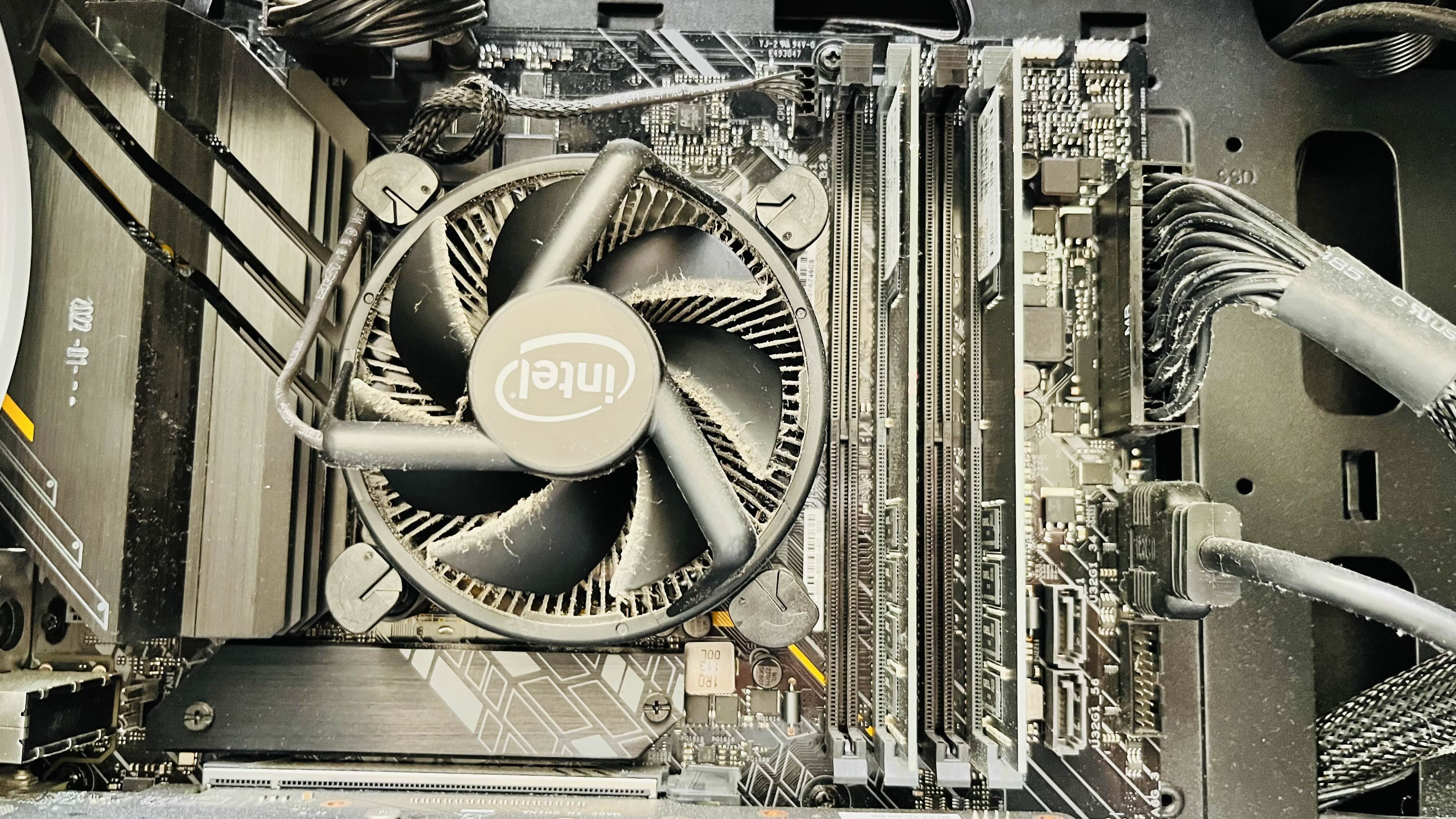 16GB PC4-25600 램입니다. 동작클럭은 3200MHz입니다. 기존의 메인보드를 보면 램이 2개 꽂혀 있었습니다. CPU에 먼지가 많네요.