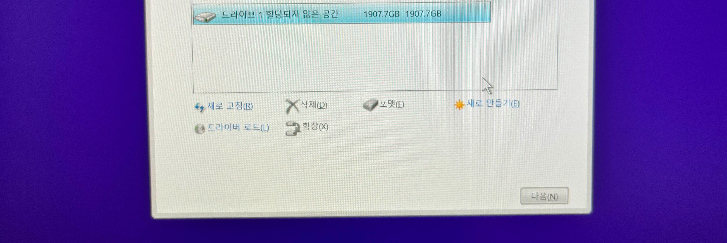 기존 SSD를 빼내고, 팀그룹 MP34를 꽂은 후 윈도우를 새로 설치하였습니다. 처음에는 파티션 할당이 되어 있지 않네요.