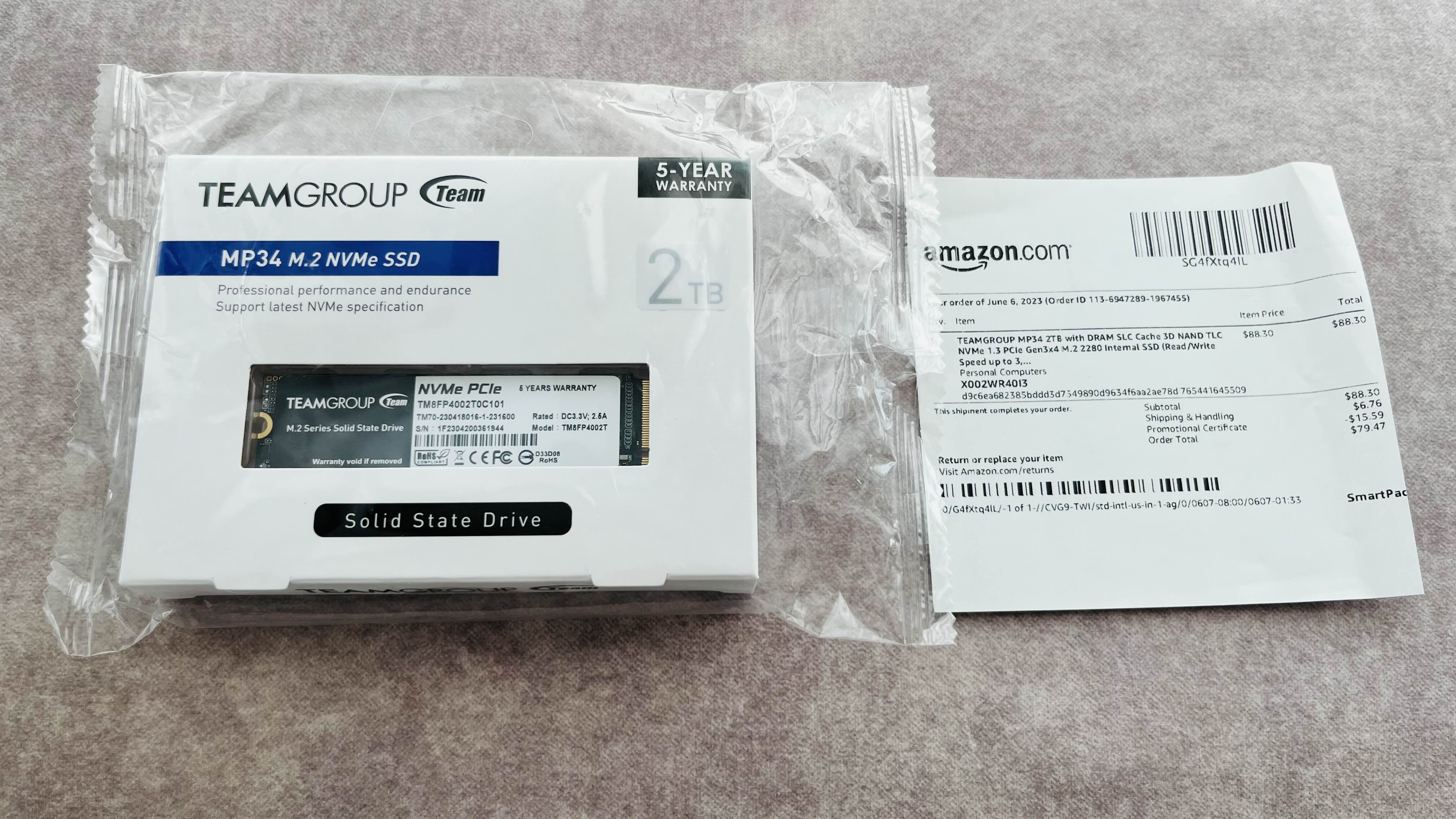 도착한 제품은 대만 회사인 TEAMGROUP의 제품으로 PCIe 3.0*4 를 지원합니다. 5년 워런티이고, mp34 버전은 DRAM이 있는 버전이라 성능도 나쁘지 않습니다.