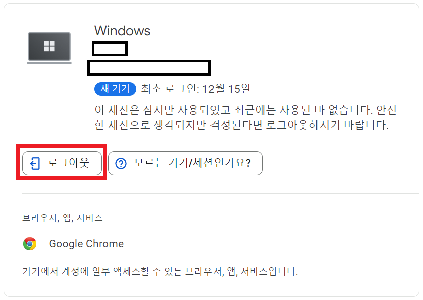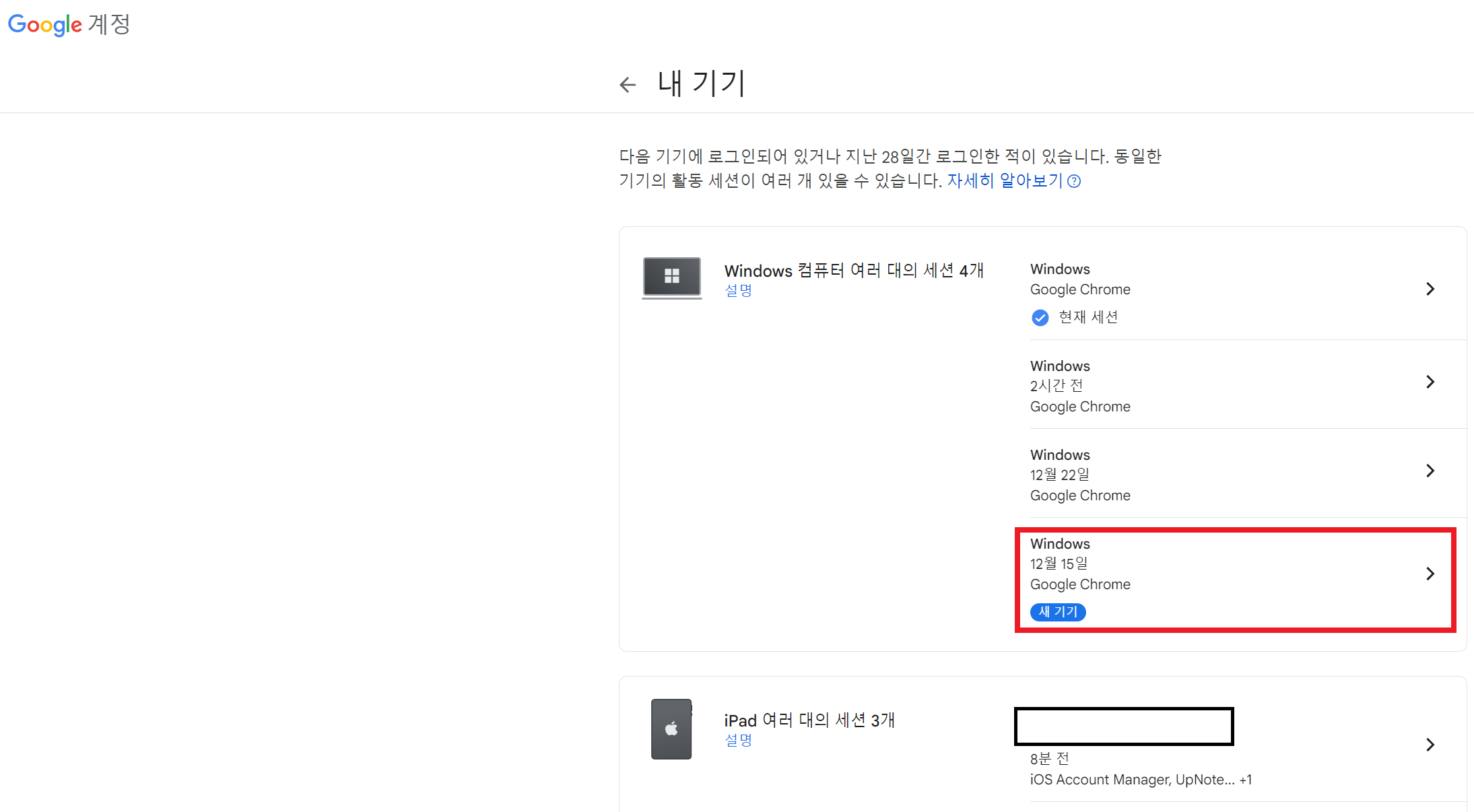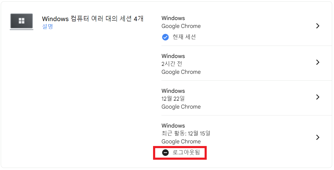 '모든 기기 관리'를 누르면 OS별로 더 자세하게 기기 목록이 나옵니다. 저는 이 중에서 윈도우 컴퓨터 중 12월 15일에 로그인 한 크롬 브라우저를 로그아웃하려고 합니다. 평소 로그인하지 않았던 기기이기에 '새 기기'라고 파란색으로 나옵니다. 여기서 오른쪽 화살표를 누르면