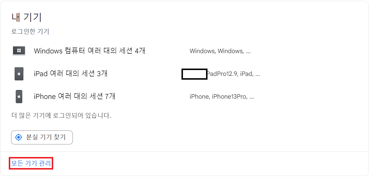 '보안'을 누른 후 화면 아래쪽으로 가 보면 '내 기기'라는 부분이 나옵니다. 여기에 보면 구글 계정으로 로그인한 나의 기기가 주욱 나옵니다. 윈도우 컴퓨터도 있고, 아이패드, 아이폰 등 세션이 여러 개가 나옵니다. 많이도 로그인했네요. 이 중에서 아래쪽에 '모든 기기 관리'를 눌러 줍니다.