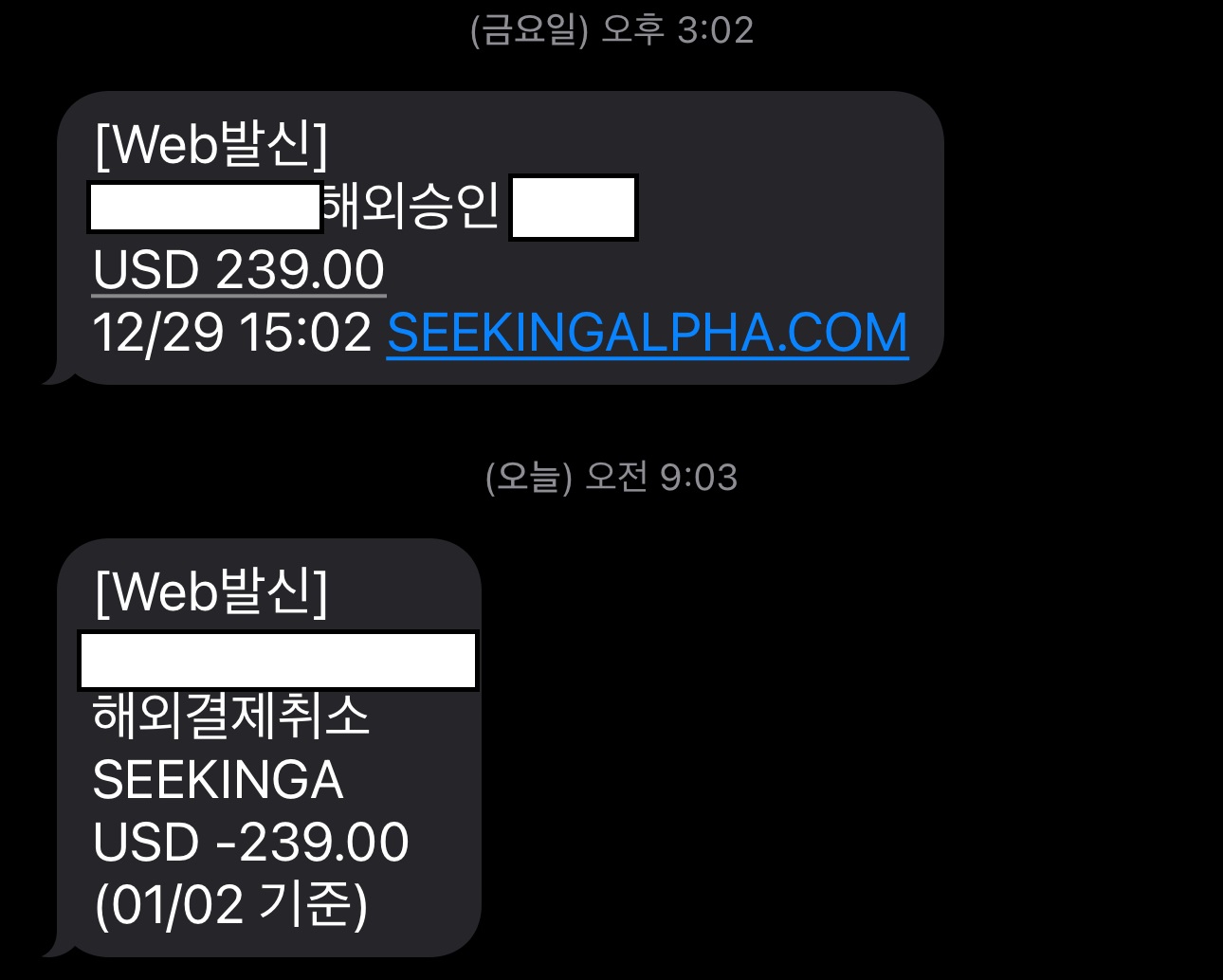 결과적으로 몇 번 보지도 않았네요. 스마트폰앱으로 접속을 하면 번역 기능이 안 되고, PC로 접속하기는 귀찮았습니다. 역시나 구독은 함부로 하면 안 되는 것 같습니다. 거기다 미리 구독 취소를 누르기를 깜빡하고 안 했습니다. 그러다 1년이 훌쩍 지났고, 2023년 12월 29일 카드 문자 메시지가 도착하였습니다. 자동 구독 갱신이 되어 239달러가 결제되었습니다.