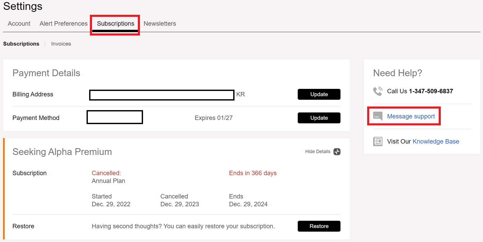사실 구독을 취소하는 방법은 간단합니다. 시킹 알파 구독 중에 구독 취소를 누르면 계약된 기간(보통 1년)만큼 이용하고 자동으로 해지가 됩니다. 오늘 알아볼 방법은 취소라기 보다는 환불받는 방법입니다.