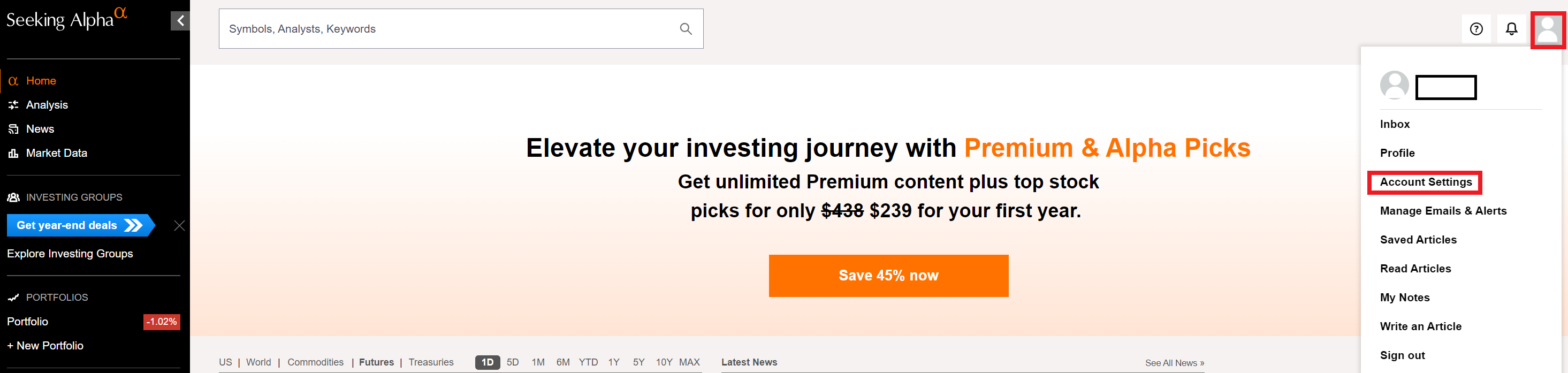 -먼저 시킹알파 로그인 후 오른쪽 위 사람 모양 아이콘을 누르고, Account Settings를 누릅니다.