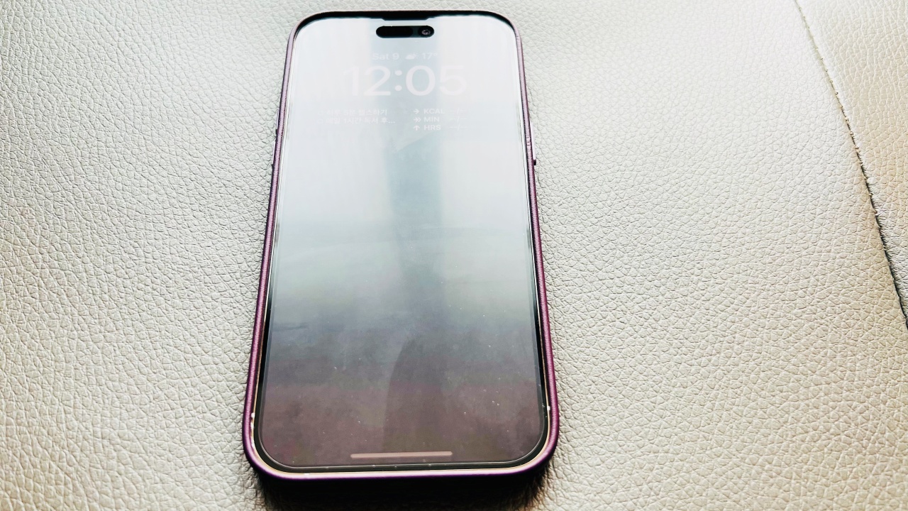 아이폰14프로맥스에 장착한 앞모습입니다. 필름을 저반사 지문 방지 필름을 붙였더니 확실히 반사가 덜 한 것 같습니다. 테두리 부분이 적당히 튀어나와 있습니다.