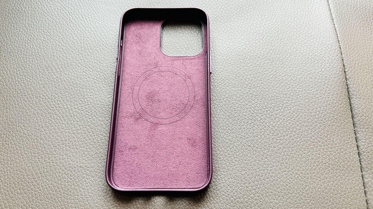 비닐을 뜯어 보면 안쪽에는 이렇게 정품 가죽 케이스와 마찬가지로 부들부들한 벨벳 같은 재질로 처리되어 있습니다. 맥세이프 링 모양이 보이네요. 저는 보라색을 구입하였습니다.