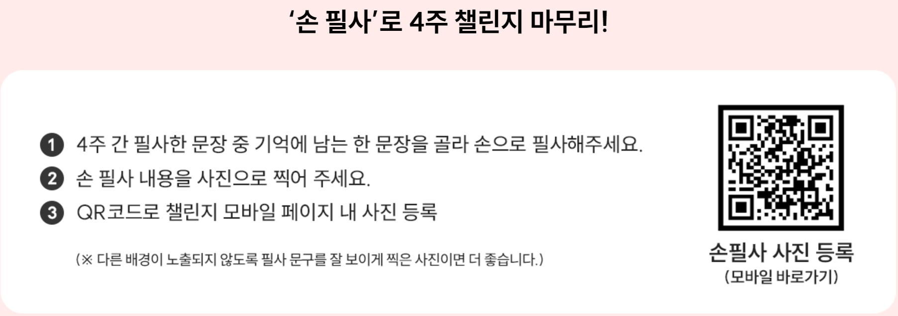 QR코드로 그동안 온라인으로 기록한 문구 중 하나를 골라 손 필사를 한 후 사진을 찍어 올리면 됩니다.