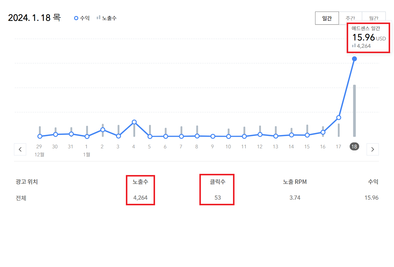 결과는 노출수 4264에 클릭수 53에 하루 수익이 15.96달러입니다.