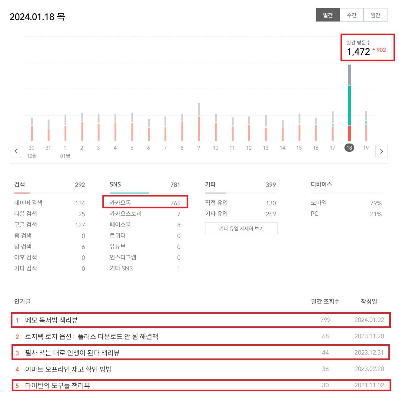 24년 1월 18일 아침부터 블로그 방문자수가 갑자기 많다 싶더니 결국 하루 평균 방문자수의 3배 정도의 분들이 방문을 해주셨습니다. 제 블로그에는 평소 400~500명 정도가 방문을 합니다. 그런데 1월 18일에는 1472명이 방문을 하셨네요. 그 원인과 결과를 남깁니다.
