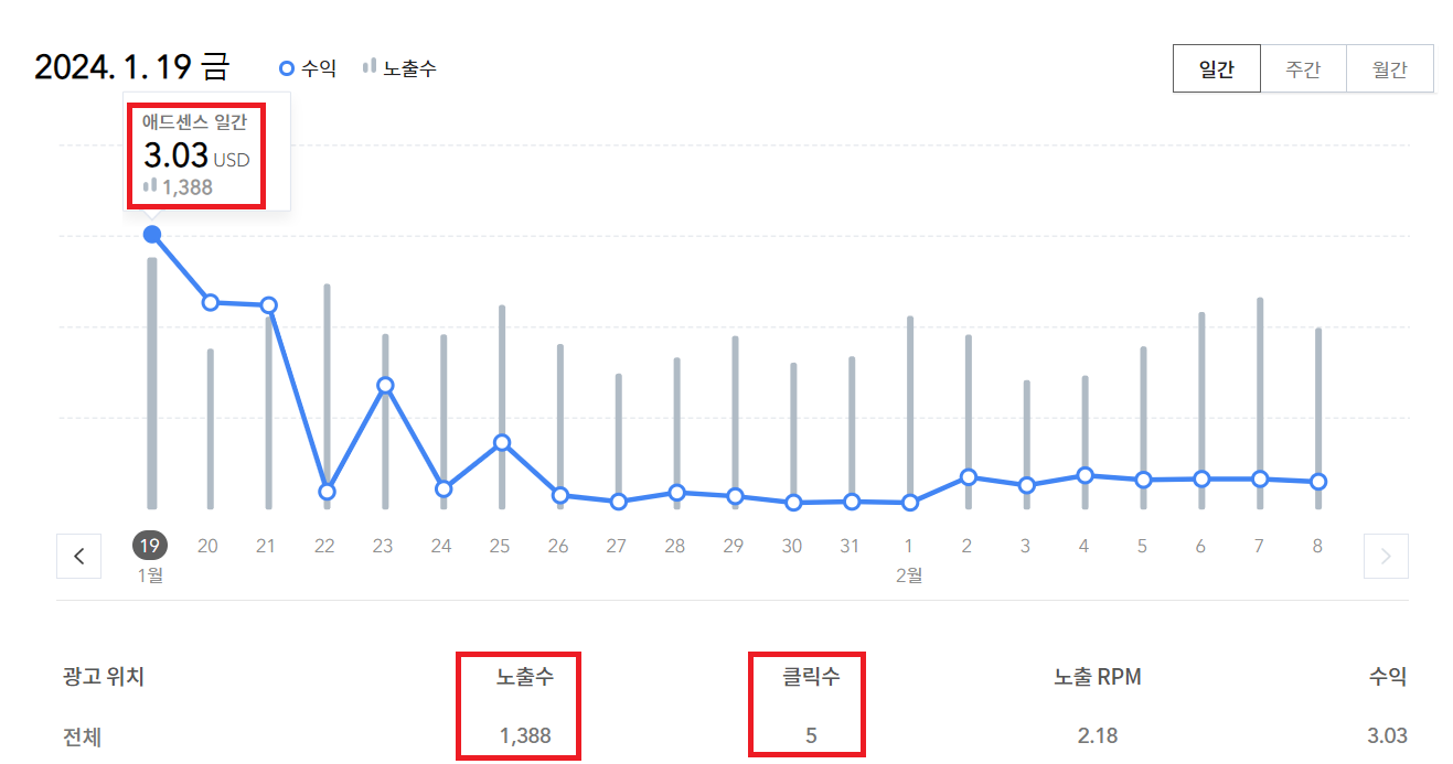 1월 18일 폭등 이후에는 방문자 수가 급격히 정상 복귀하였고, 클릭수도 떨어졌지만 2~3일 정도는 평소보다 수익이 많게 나왔습니다. 지진 후 여진이 오는 것과 비슷하네요. 물론 이후에는 다시 완전히 정상(?)으로 돌아왔습니다.