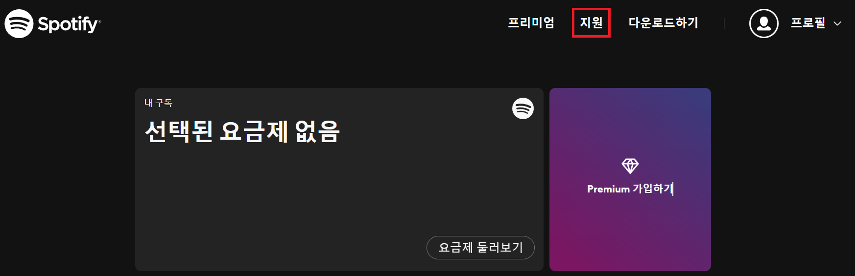 1. 먼저 스포티파이 계정에 로그인을 합니다. 로그인 후 위쪽 메뉴 중에 '지원'을 누릅니다.