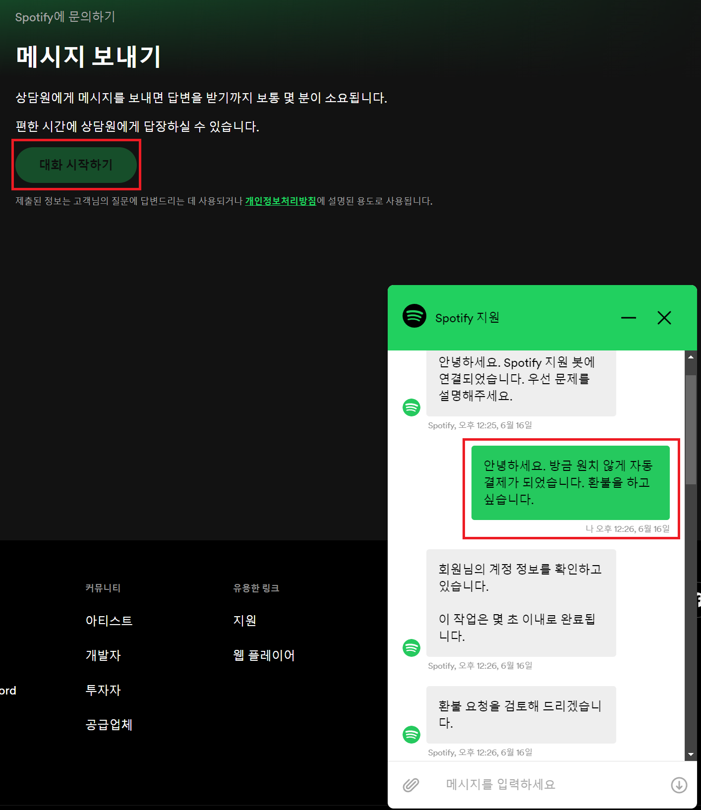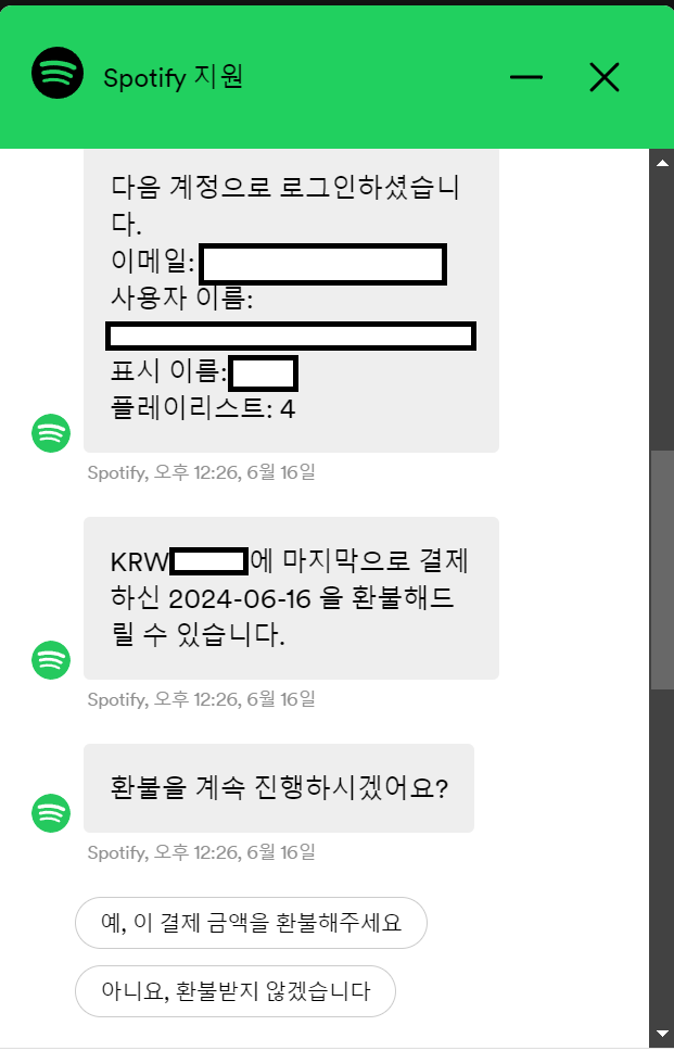 지난 번에 시킹알파 환불의 경우에는 이메일로 처리가 진행되었는데, 스포티파이는 채팅창으로 처리가 되네요.