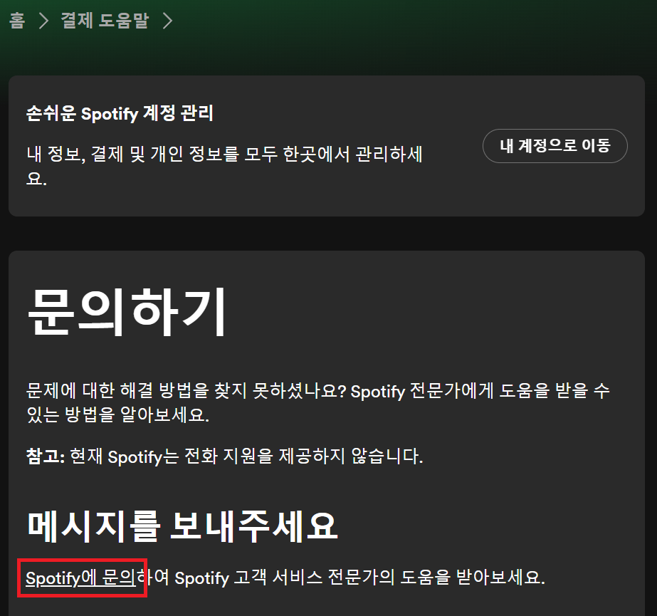 3. '메시지를 보내주세요' 라는 큰 글자 아래에 'spotify에 문의' 라는 링크가 있으니 누릅니다.