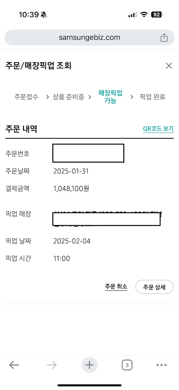 이 중 계속 상품 준비중 상태이다가 픽업일(2.4)인 당일 삼성스토어 오픈 시각(10시 30분)이 지나서야 '매장픽업 가능'이 뜨더군요.