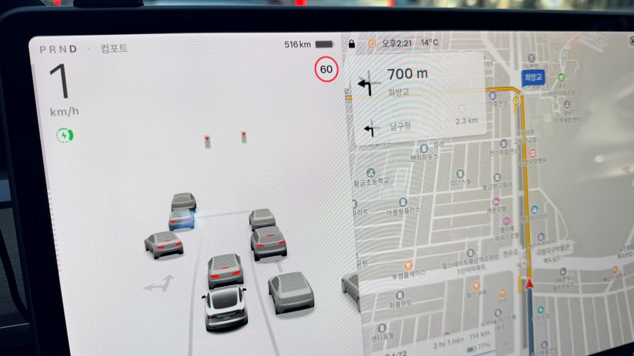 물론 완전 FSD는 아닙니다. 최근 한국에서도 모델S와 X에서 FSD 가능한데, 3와 Y 에서는 아직 지원되지 않고 있습니다. enhanced Autopilot만 구입하여 사용 가능하죠. 이 강화된 오토파일럿을 테슬라 대여 차량에서 이용 가능합니다. 그래봐야 기존의 오토파일럿과 다른 점이라고 하면 자동 차선 변경과 자동 주차, 차량 자동 불러 내기(?)가 가능하다는 점이죠. 실제로 자동 차선 변경은 편했고, 자동 주차는 아내가 잘 사용했습니다. 차량 자동 불러 내기는 잘 작동하지 않아서 몇 번 시도해보고는 이용하지 않았습니다.