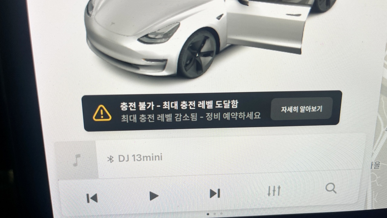 모니터에 나온 메시지를 보면 차량 주행에는 문제가 없고, 차량 충전 상태가 50% 미만일 때 충전할 수 있다고 나옵니다.