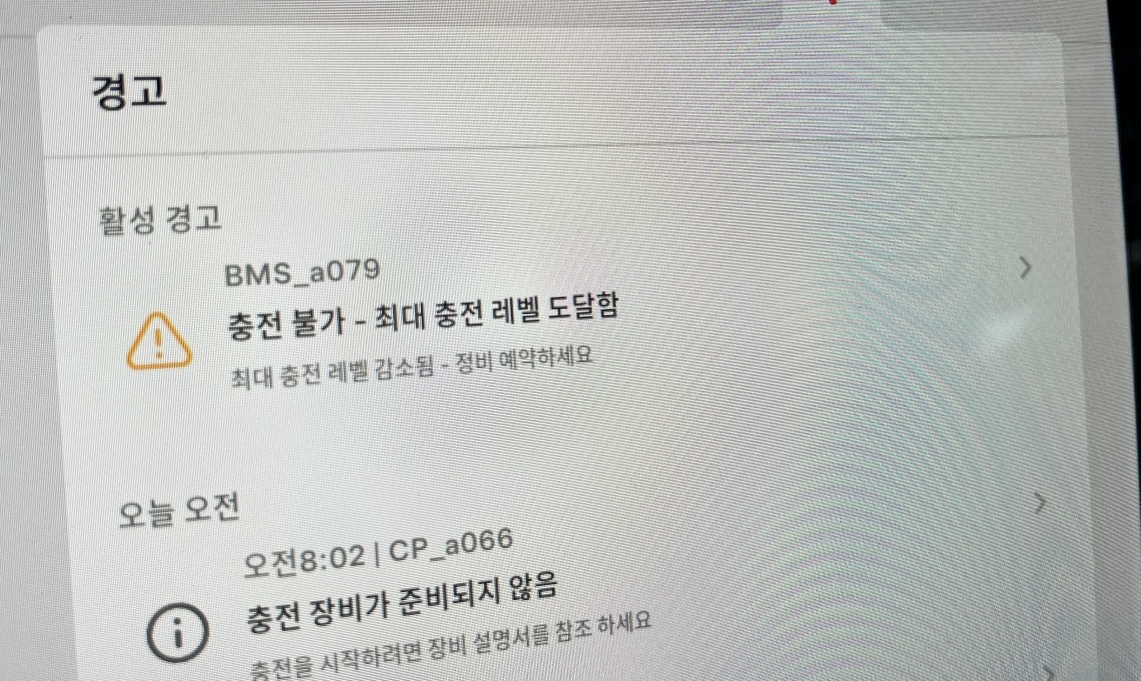잘 운행 중이던 제 차에 BMS_a079 뜬 것은 2025년 9월 5일이었습니다. 오전 8시쯤에 확인했네요. 아침에 차를 운행하려고 보니 경고 메시지가 아래 사진과 같이 떴습니다.