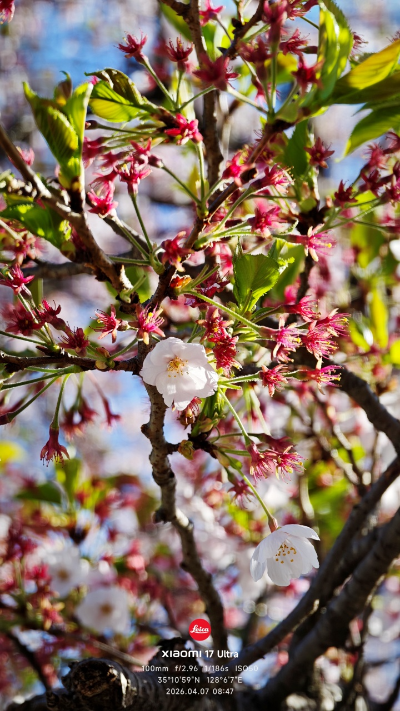 1. 배경을 단순하게: 잎이 없는 상태에서 꽃만 피어 있기 때문에, 파란 하늘을 배경으로 아래에서 위로 찍으면 꽃의 색감이 훨씬 선명하게 살아납니다.